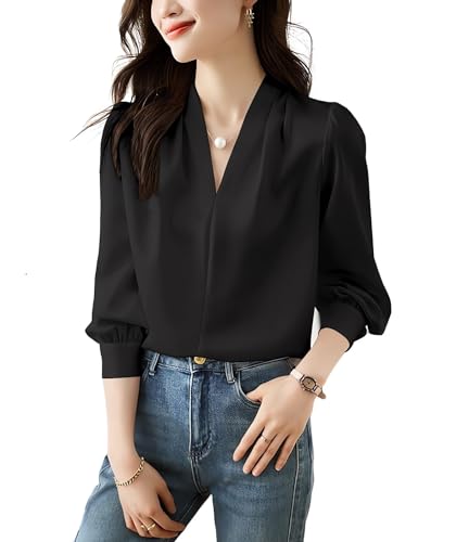 [NISSAI] ブラウス シャツ レディース ビジネス オフィス フォーマル スーツ 就活 OL 事務服 無地 入学式 卒園式 大学 UV 紫外線カット 通勤 長袖 春 夏 30代 Vネック シルク 黒 L, ブラック 高価買取中