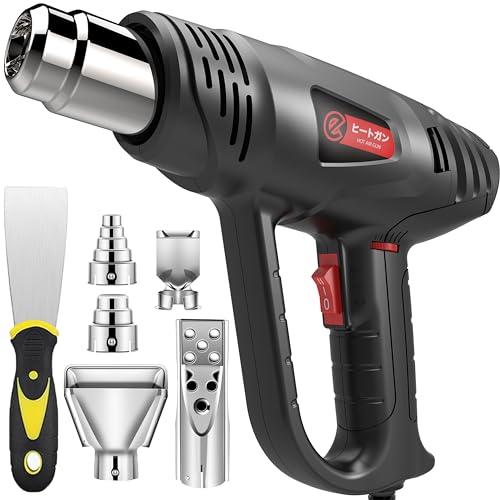 ヒートガン 2024年新発売。産業用・家庭用、段階風速と無段階調温機能(50~650度)。多用途で、ノズル5本とスクレーパー1本付き。PSE認証、二重絶縁設計。