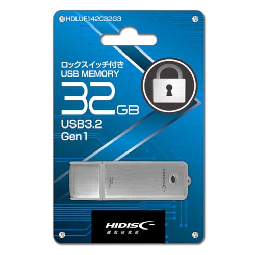 HIDISC USB3.2 Gen1メモリ HDLUF142C32G3は、32GBのストレージを提供し、ロックスイッチでデータを保護します。高速転送が可能で、耐久性に優れています。