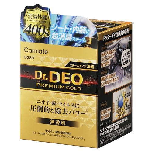 カーメイトのDr.DEOプレミアムゴールドは、強力な消臭性能400%を誇るスチーム消臭剤です。車内のシートや内装に浸透し、無香料でニオイをリセットします。普通車・軽自動車対応の使い切りタイプ。