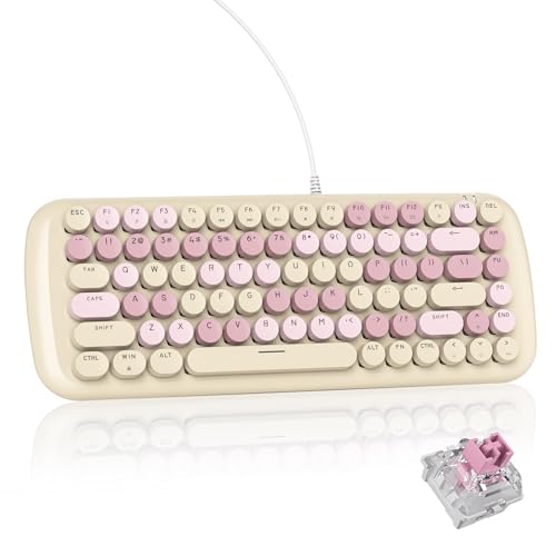 iRoboosta Milky Creamyは、84キーの美的なメカニカルゲーミングキーボード。ホワイトバックライト、かわいいレトロなデザイン、ピンクスイッチ、ラウンドキーキャップ付き。Windows/PC/PS5対応、コンパクトで使いやすい。