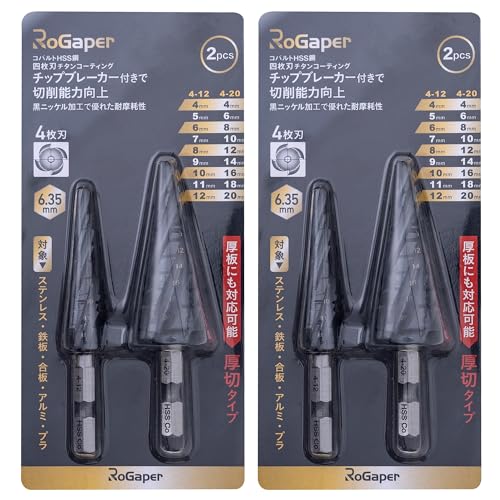 ROGAPER ステップドリルは4枚刃のタケノコドリルで、サイズは5-23mmの6段階。六角軸でコバルトハイス鋼(M35HSS-Co)製、チタンコーティング仕上げ。鉄工、木工、DIY、金属、ステンレス、プラスチックに適用、2パック入り。