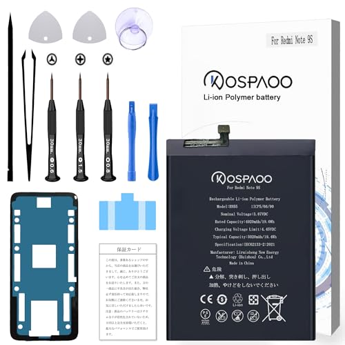KOSPAOOの互換バッテリーは、容量4920mAh、3.87Vで、Xiaomi Redmi Note 9S(BN55型)に対応。PSE認証取得済み。高温・低温耐性があり、600~800サイクルの寿命を持つ。交換修理用工具付き。