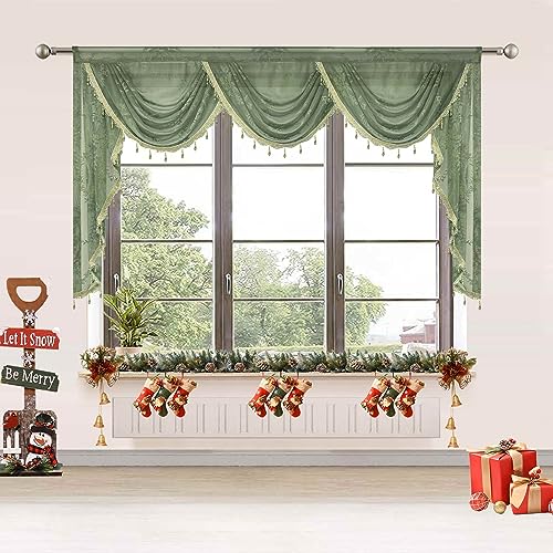 グリーンフローラルのシアーカーテン。ウォーターフォールバランスデザイン、ロッドポケット付き。ビーズ装飾あり、幅98インチ。リビングやキッチンに最適なウィンドウトリートメント。