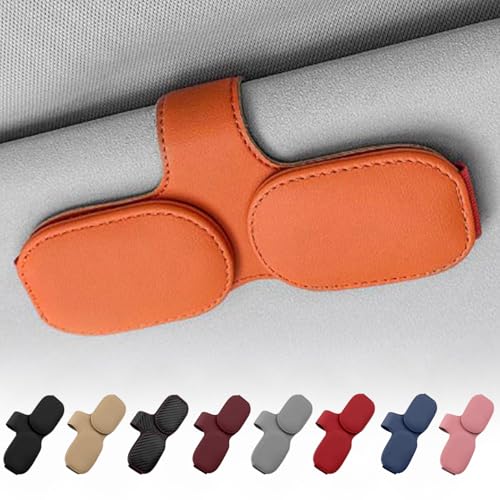 LEZARINOのサングラスホルダーは、車用のサンバイザーに取り付け可能。レザー調で、おしゃれなオレンジ色。メガネやカードを収納できる便利なアイテムです。