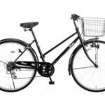Carinoの自転車は26インチのシティサイクルで、シマノ6段変速、LEDライト、大型カゴ付き。通勤・通学に最適なアルミリムを採用したモデル。人気のブラック色。