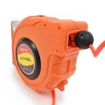 リコピンのドラム式エアーホースリールは、15mのホースを収納可能で、幅30cm×29.5cm×厚さ14cmのサイズです。内径6.5mm、外径10mm、最高使用圧力8.0kgf/cm²。外装はABS、ホースはPU素材。エアツールに最適です。