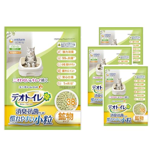 ユニ・チャーム デオトイレの鉱物タイプの猫砂は、消臭・抗菌効果があり、小粒で慣れやすい設計。飛び散りにくく、3.8Lの4袋セット。猫トイレに最適な砂です。