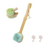 竹の柄を持つ両面ボディブラシで、シリカゲル製。背中のニキビケアやマッサージに最適。柔らかいブラシで濃密泡を作り、臭わずカビが生えにくい。滑りにくく、お風呂で美肌を実現。男女兼用(青)。