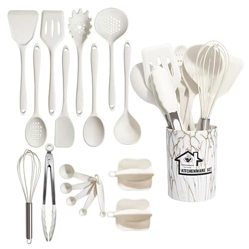 シリコンキッチン用品セット、18点セット。ストレージバケット付きの食器セットと調理器具が含まれ、便利なキッチンツールを提供します。色は白で、スタイリッシュで実用的なアイテムが揃っています。