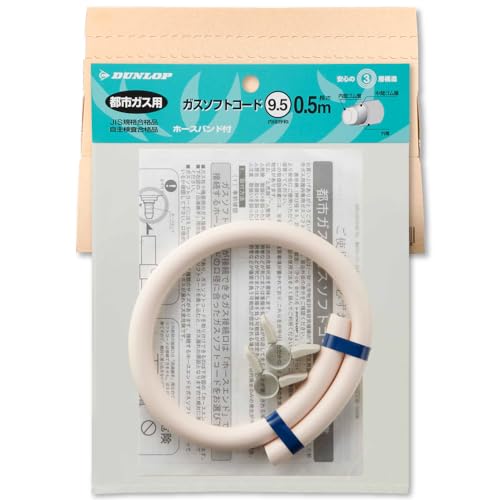 ダンロップガスホース(内径9.5mm、長さ0.5m)は、都市ガス用で、ホースバンド2個が付属しています。信頼性の高いゴム管で、ガステーブルやコンロに適しています。