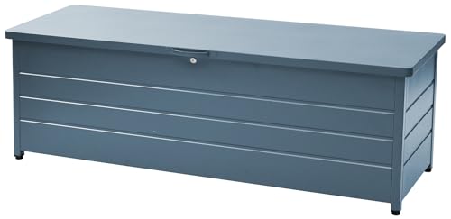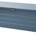 ガーデンマスターのスチール製ベンチストッカーは、幅155cm、奥行49cm、高さ52cmで天板耐荷重100kg。屋外、玄関、ベランダでの収納や休憩に最適なクラウドブルーの収納ベンチです。