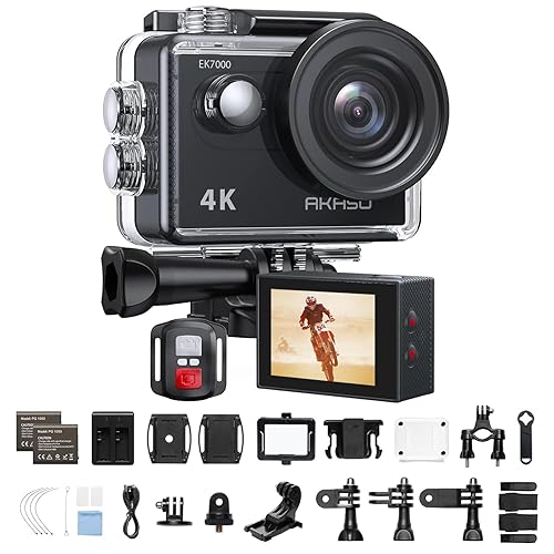 AKASO EK7000は4K30FPS、20MPの水中カメラ。WiFi、外部マイク対応で40M防水。170度広角レンズ、リモコン付き、1050mAhバッテリー2個、豊富なアクセサリーもあり、バイクや自転車にも取り付け可能。