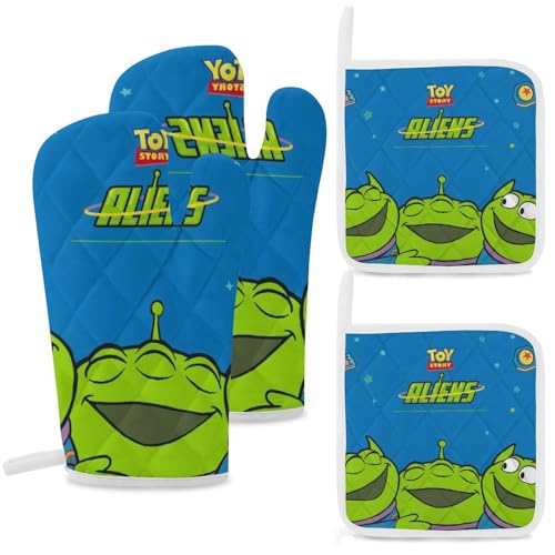 トイストーリーのエイリアンデザインの鍋つかみ4点セット。耐熱素材でやけど防止。オーブンミトン、鍋敷きも含む。アウトドアや業務用にも適した左右兼用、男女兼用のクッキングアイテムです。