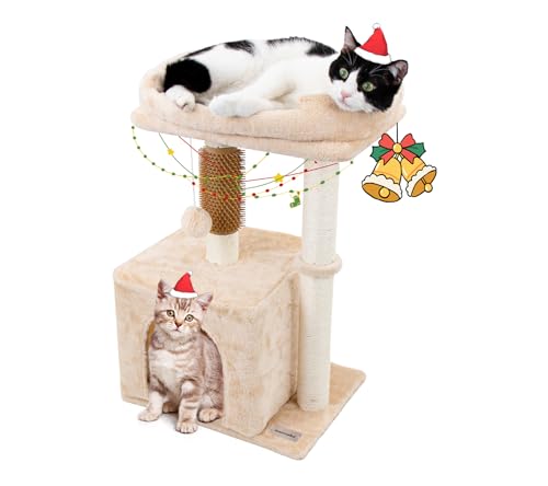 Hapinekoキャットタワーは、高さ68cmのコンパクトなミニ型です。セルフグルーマーや爪とぎ、見おろし展望台、隠し部屋付きで、2点のポールを備えた猫の楽しめる空間を提供します。