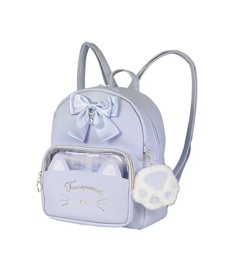 ネコリボンミニリュックは、ライトブルーの合皮製で、猫と肉球のデザインが特徴です。女の子の小学生にぴったりのかわいいリュックで、通学や通園、お出かけに最適です。