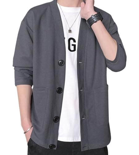 エブリワンラフスの春秋用メンズカーディガン。薄手ワッフル生地で軽量、通気性抜群。Vネック長袖、無地デザインでビジネス・カジュアルにも最適。大きいサイズもあり、冷房対策に便利。