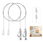 ピクチャーレール ワイヤー フックセット。自在金具付き、ステンレス製ワイヤーロープ2本(直径1mm×長さ1.5m)。落下防止機能あり。絵画や額縁、壁掛けの展示に最適で、地震対策にも対応。