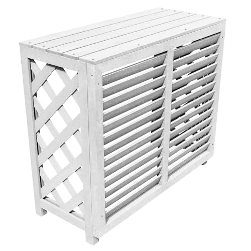 アイガーデンのエアコン室外機カバーは2024年仕様で、ホワイトのルーバーデザイン。内寸は幅80cm、奥行34.5cm、高さ71.5cmで、組立式のアイウッド人工木製オリジナル商品です。