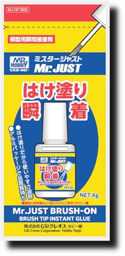 GSIクレオスのMr.ジャストはけ塗り瞬着は、ホビー用接着剤で、速乾性と強力な接着力を持ちます。4gの使いやすいサイズで、精密な塗布が可能です。