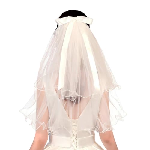 蝶結びウェディングベールは、2層の波打つ縁が特徴で、コーム付き。優雅なショートチュールヴェールは、花嫁のシャワーやバチェロレッテ、結婚式の写真に最適なヘアアクセサリーです。