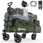 Sekeyの後ろ開けキャリーワゴンは、2way仕様で長物にも対応。大容量200L、耐荷重150kgで、ベアリング内蔵の静音大型タイヤ。ブレーキ付きで自立収納可能。アウトドアや運動会に最適なダークグリーンのデザイン。