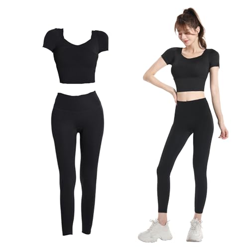 SooPiiのヨガ レディース上下セットは、2分袖ブラトップとハイウエストレギンスの組み合わせ。吸汗速乾性と通気性に優れ、カップ付きで快適な着心地。オシャレでトレーニングに最適。サイズはM、カラーはブラック。