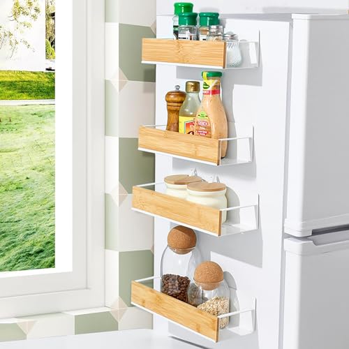 調味料ラックのマグネット4点セットは、冷蔵庫や洗濯機の側面に取り付け可能。穴開け不要で簡単に設置でき、スパイスや調味料をすっきり収納できる便利なアイテムです。色は白です。