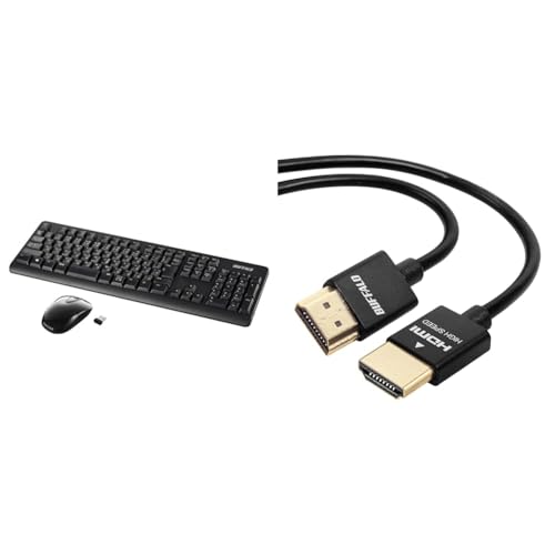 バッファローのワイヤレスフルキーボードと静音マウスのセット。高耐久で電池長持ち、疲れにくいデザイン。簡単接続。HDMIスリムケーブルは1m、4K×2K対応でARC対応。