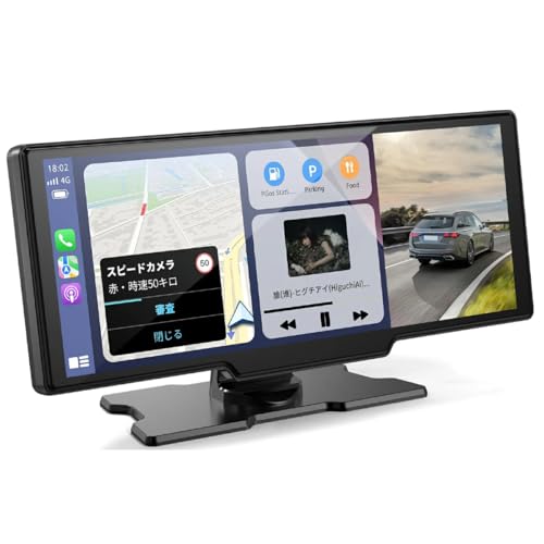 ディスプレイオーディオは、4Kフロントカメラと1080Pリアカメラを搭載し、10インチの大画面でCarPlayとAndroid Autoに対応。WiFi、Bluetooth接続で音声出力が可能。ナビ、音楽、電話機能を備え、64GBカード付きで工事不要。日本語説明書あり。