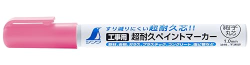 シンワ測定の工事用超耐久ペイントマーカーは、細字の丸芯を持ち、蛍光ピンク色のインクを使用。耐久性に優れ、屋外でも使用可能で、明るく目立つマーキングができます。