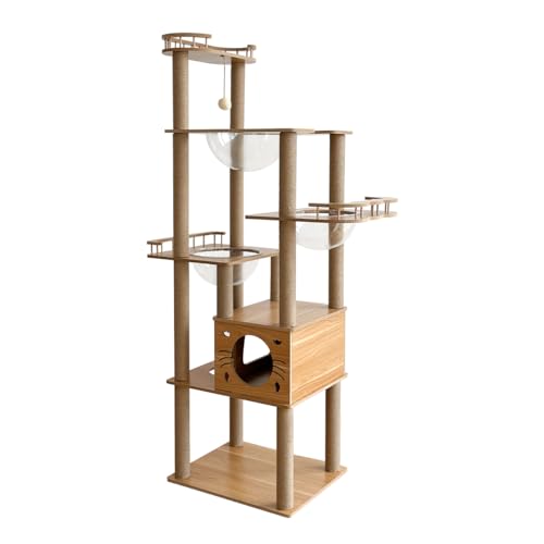 RAKUキャットタワーは宇宙船付きのハイタイプ。高さ約183.5cm、木製で据え置き型。爪とぎボールや展望台も完備。大型猫や多頭飼いに最適。運動不足解消にも。