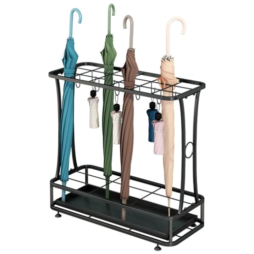 大容量の傘立てで、18本収納可能。水受け皿付き、フックもあり、安定した省スペースデザイン。家庭用・業務用に適し、おしゃれなブラックで人気があります。