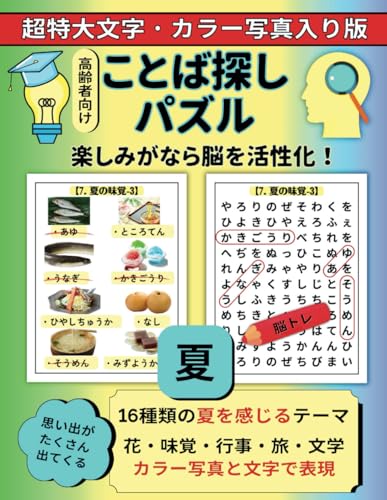 「ことば探しパズル 高齢者向け 超特大文字版・カラー写真入り・夏を感じる編」は、楽しみながら脳を活性化するアイテムです。夏の思い出をひもとき、脳トレや脳活にぴったり!大文字で見やすく、楽しみながら挑戦できます。