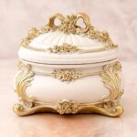 蓋付きの陶器製アクセサリーケース。リボンとベルのデザインが特徴で、アンティーク調のロココスタイル。おしゃれでかわいいインテリア雑貨として、誕生日プレゼントにも最適です。