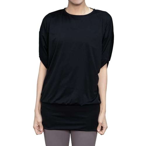ヨガドルマンスリーブトップスは、ゆったりとしたデザインで体型カバー効果あり。半袖で夏に最適、吸汗速乾性とUVカット機能付き。おしゃれでかわいいブラックのLサイズ。
