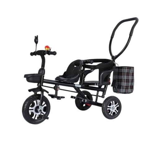 双子用自転車は三輪車で、安全ベルト付きペダル自転車です。押し手ハンドルや後輪ロック、物置きカゴ付き。8ヶ月から7歳まで使用可能で、アウトドアや室内で楽しめるプレゼントに最適です。