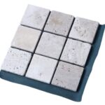 リビングアウトの天然石マット4枚セット。サイズは30×30cm、ベージュの9分割タイルで、石畳風のデザイン。防草シートとして雑草対策に最適。庭やガーデンに敷くだけで簡単に使用可能。