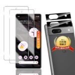 Google Pixel 7A用の強化ガラスフィルム2枚とカメラフィルム2枚のセットです。旭硝子製で9H硬度、全面保護、耐衝撃、飛散防止、高透過率、超薄型、指紋認証対応、気泡防止。簡単に貼り付け可能です。