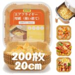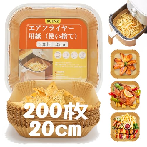 KUENZエアフライヤー用紙200枚セット。サイズ20cmの四角形で、ノンフライヤーに対応。耐熱230℃、耐油・耐水性あり。電子レンジ・オーブン・蒸し器にも使用可。