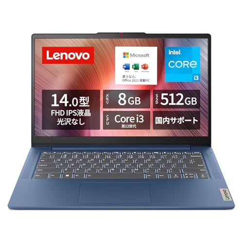 Lenovo IdeaPad Slim 3は、13世代インテルCore i3搭載、8GBメモリ、512GB SSD、MS Office 2021付き。14インチ、バッテリー14.3時間、重量1.37kgのアビスブルーのノートPCです。