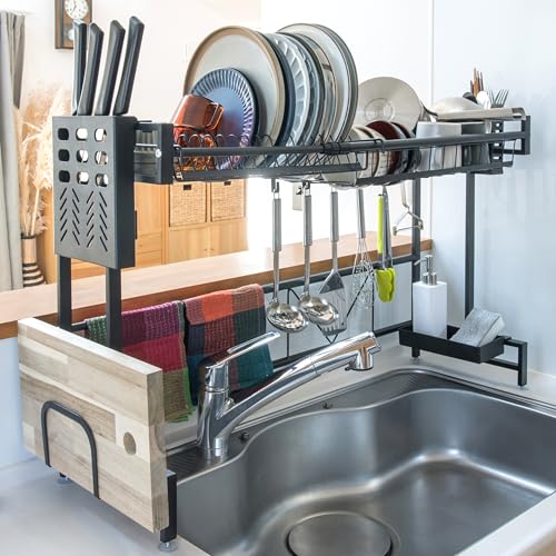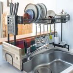 水切りラックはシンク上で使用でき、抗菌性に優れた省スペース設計。大容量でワイドな水切りかごは、整理整頓を助け、ブラックとホワイトの2色展開。
