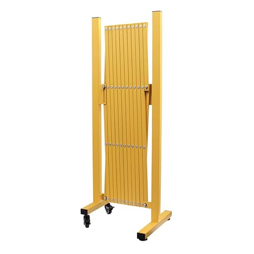 アルミ製フェンス、門扉、ゲートはキャスター付きで伸縮可能。目隠し効果があり、屋外での使用に適したペットゲート。最大幅3mで、エクステリアやガレージの間仕切りに最適。カラーはイエロー。