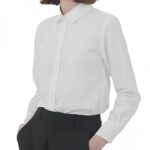 YASHIGEのノーアイロンワイシャツは、レディース用の長袖ブラウス。形態安定でビジネス、オフィスシーンに最適。カジュアルにもぴったりなゆったりしたデザイン。速乾性と高通気性で快適、ホワイトのSサイズあり。