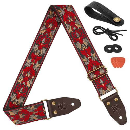 Amumuのハート刺繍ギターストラップは、ヴィンテージスタイルのトップグレインレザーエンドとピックポケット付き。ベース、エレクトリック、アコースティックギターに適合します。
