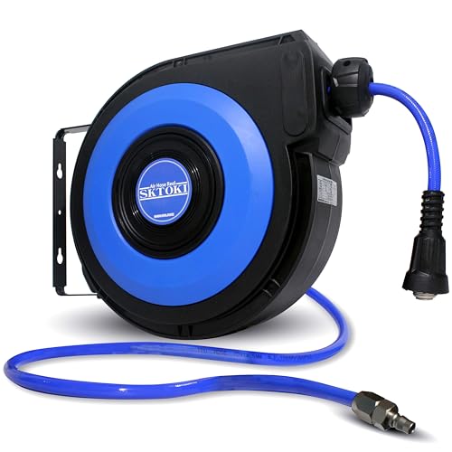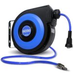 88HOUSEのエアホースリールは自動巻取式で、10mのホースを備えています。ブラケット付きで壁掛けや天吊りが可能、180°回転可能なデザイン。空気圧工具に最適で、日本語説明書も付属しています。