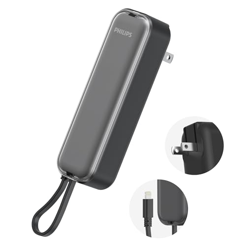フィリップス DLP5201VBは、5000mAhの大容量モバイルバッテリーで、内蔵Lightningケーブルを使い二台同時充電可能。ACプラグ付きで、軽量設計と小電流デバイス対応。PSE認証済みで安心。