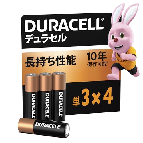 デュラセルの単3形アルカリ乾電池4本入り。保存期間は10年で、PCマウス、キーボード、リモコン、時計、おもちゃに最適です。信頼のブランド、うさぎのマークが目印です。