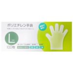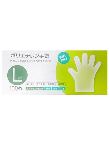 大和物産の使い捨て手袋(Lサイズ)は100枚入りで、内エンボス加工によりべたつきにくい設計。約27.5×28.4×9.2㎝の半透明なデザインで、料理や掃除、介護に最適です。