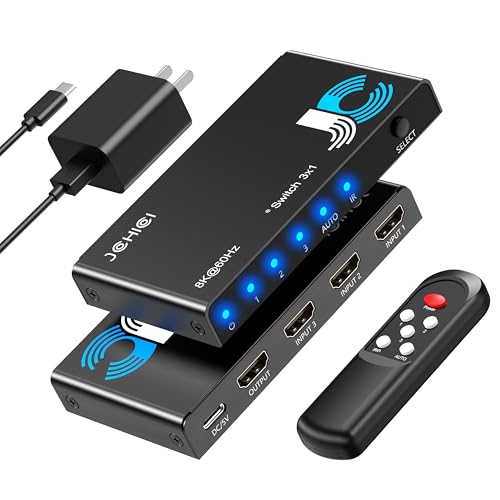JCHICI HDMI切り替え器は3入力1出力、8K@60Hz対応。リモコン付き、HDCP 2.3/HDMI 2.1、選べる切替機能。PS3/PS4/PS5/Switch動作確認済み。日本語説明書付属。